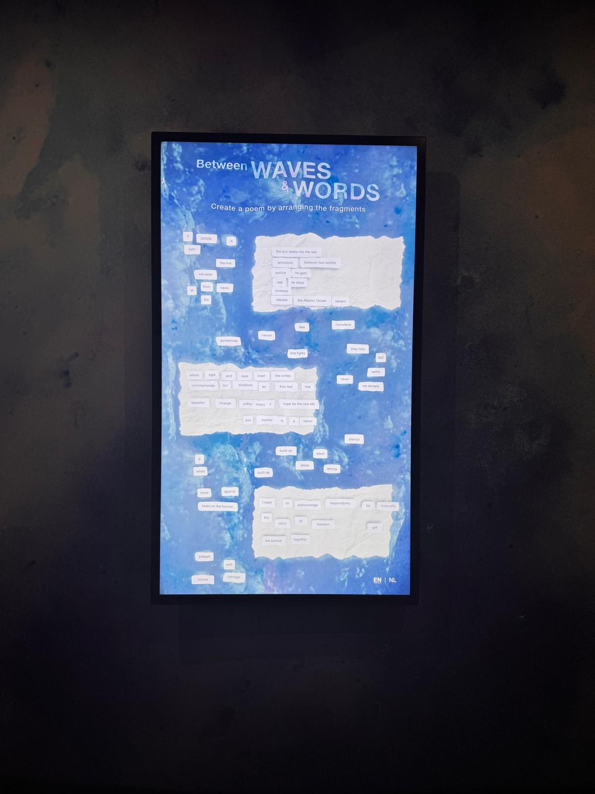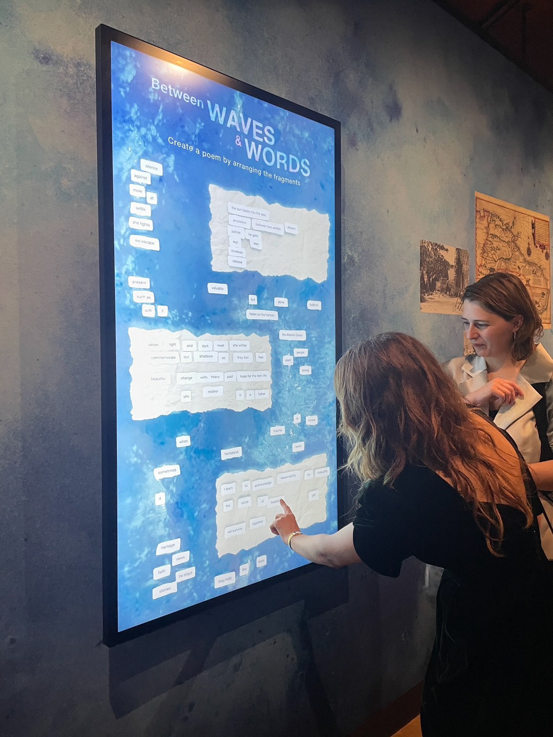 The interactive touchscreen invites visitors to reflect on the impact of colonial history, past and present. By arranging floating words, they create poetic reflections for others to read or build upon.The concept for this installation was inspired by the simplicity of fridge magnets. Visitors create their own poetic compositions, using a curated set of evocative words and phrases that reflect the themes of the exhibition. Like fridge magnets, visitors leave their reflections for others to read or build upon. This collaborative element fosters a sense of shared storytelling.